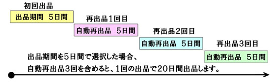 下の例は5日間で設定し出品した例です、例の様に出品期間を5日間で設定した場合、自動再出品3回を